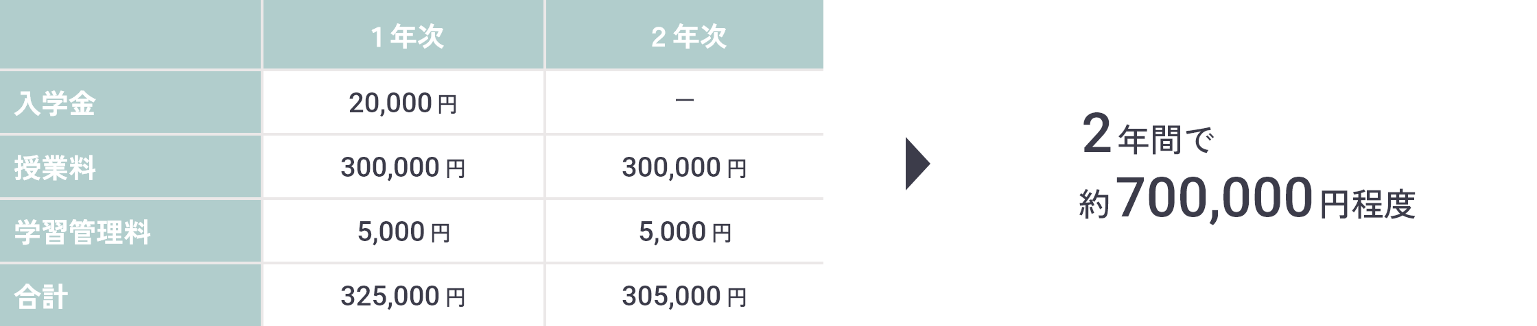 - 上記の金額に別途、学生証発行料、テキスト代、教材代がかかります。